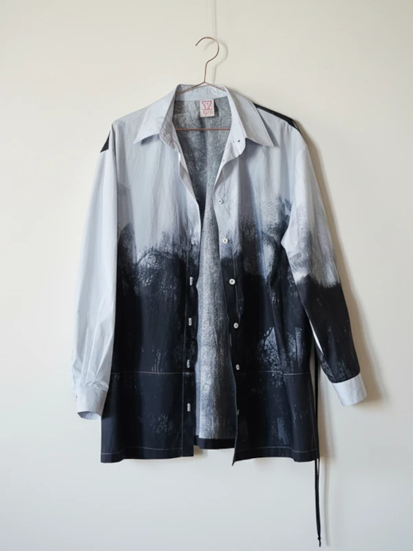 Camicia leggermente oversize in cotone con stampa sfumata bianco-nero, realizzata con tessuto d’atelier recuperato. Ogni capo è unico.